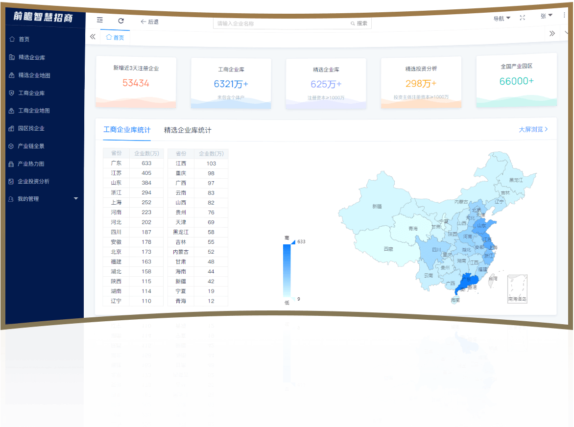 采用大数据信息实时采集,汇集全国6321万+企业数据,66000多个产业园区数据,精选企业625多万,精选企业投资关系近300万,实现多维度智能企业匹配查询,企业按地图选定范围内查询,全国产业热力图查询,精选产业链上下游重点企业地图,全国产业园区招商企业名录,以及企业对外投资分析、区域产业转移分析等功能,为企业、政府招商提供决策支持,同时系统提供企业联系电话数据、企业数据下载服务、招商客户跟进管理、多账户管理等功能服务。